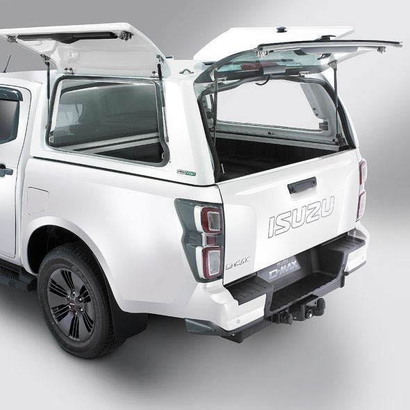 Hardtop fra ProTop Gullwing med glasrude i bagdøren lakeret i køretøjets originalfarve til Isuzu D-Max D/C Årgang 2025+