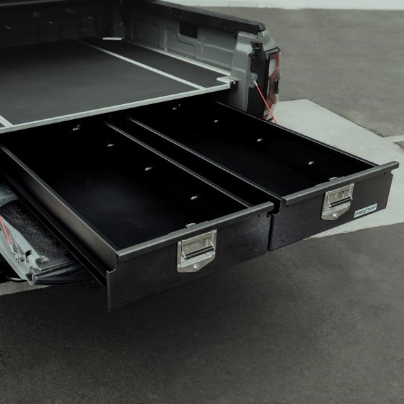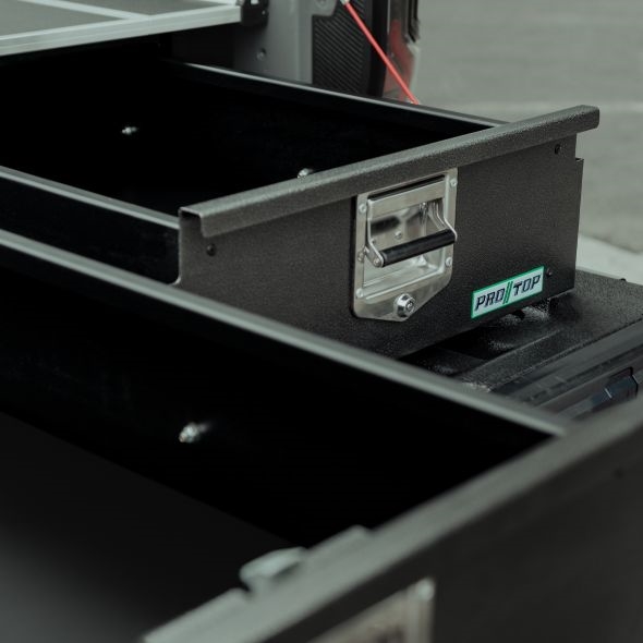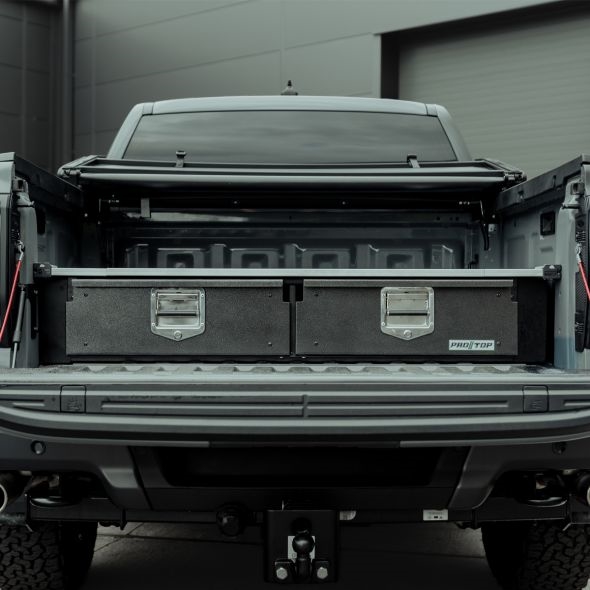 ProTop tilbyder et stort udvalg af ladudtræk, udtræk med skuffer og denne dobbelte skuffe med et fast Rhino-dækgulv.
