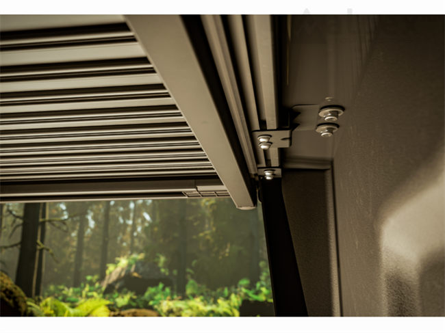 Håndtaget er placeret på undersiden af coveret og kan derfor kun åbnes når bagklappen er åben. Herudover er EVOe'en designet med knivsikre sammenlåste aluminiums lameller. Det unikke design med sammenlåste lameller i knivsikret aluminium gør det umuligt at dem tvinge fra hinanden.
