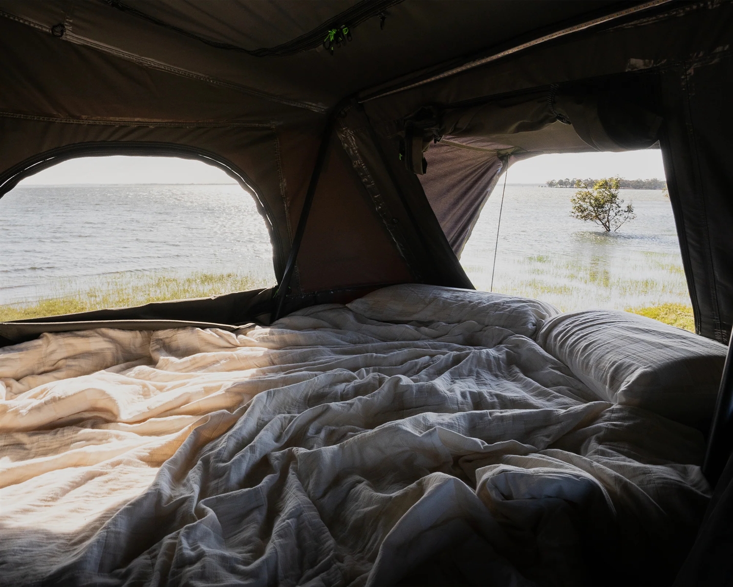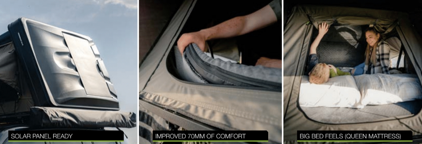 Sov længere med 320 kvadratmeter Ripstop Polycotton, til temperatur- og lyskontrol. Ventilation for at holde din soveluft frisk og for at reducere kondens. Stor queen size seng med to-delt madras. Sidevinduesmarkiser for vejrbeskyttelse og ekstra ventilation. Tyk højdensitetsmadras med 3D-antikondensationsmåtte for støtte og komfort. Varmeledningstilførsel og valgfri termisk foring til de koldere måneder.